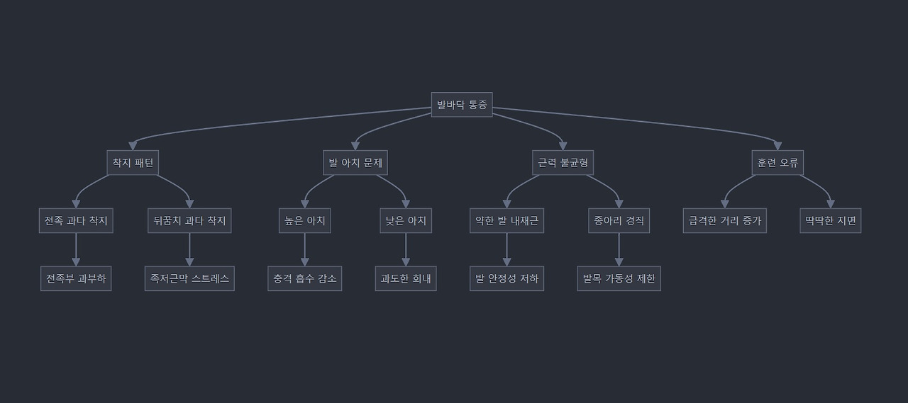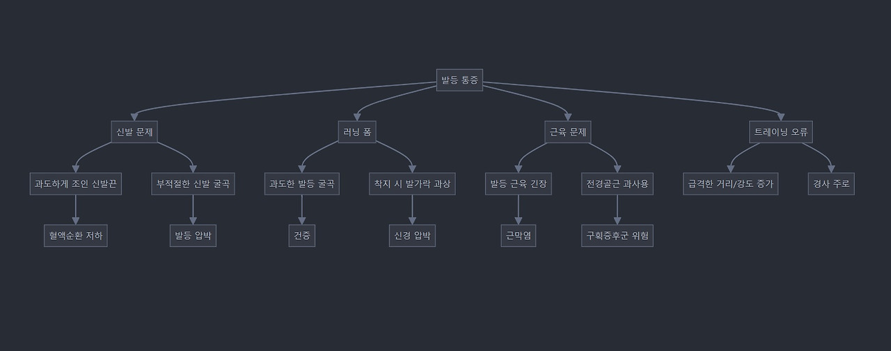 러닝 시 발등 통증이 생기는 원인은 크게 네 가지다. 그중 러닝 폼과 연관이 있는 것은 과도하게 발등을 구부리는 것과 착지 시 발가락을 드는 동작이다. 전문적인 선수일수록 발목과 정강이의 각도가 좁은 것이 좋다. 하지만 일반인 중에선 그곳이 뻣뻣한 사람도 많다. 충분히 연습이 되지 않은 상태에서 과도하게 사용되면 앞정강이와 연결된 힘줄에 염증이 생긴다고 한다. 착지 시 발가락을 드는 동작 역시 앞정강이 근육을 자극한다.