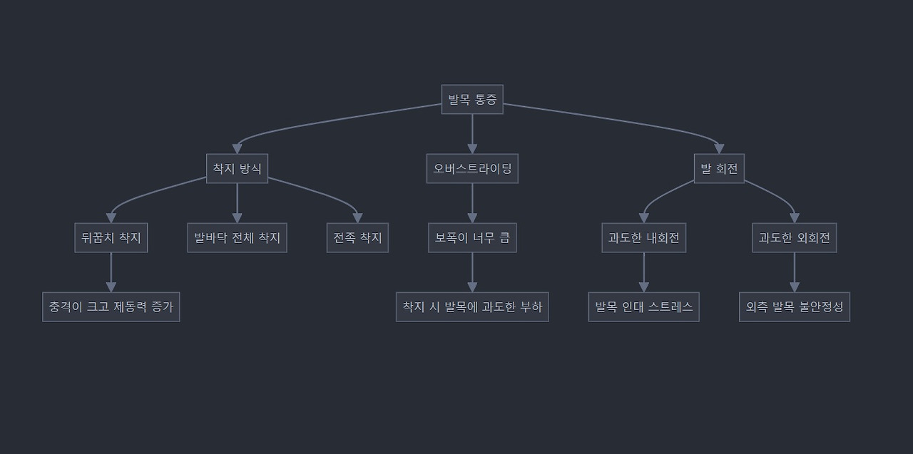 러닝 시 발목 통증의 원인은 크게 세 가지다. 그중 폼과 연관이 있는 것은 착지 방식과 오버스트라이딩이다. 계속해서 말하지만 착지 방식은 그 자체로 문제라기 보단 착지 위치와 착지 방식을 함께 고려해야 하는 문제다. 그렇기 때문에 모든 착지 방식은 발목에 통증을 유발할 수 있다. 또한 과도하게 리어풋, 과도하게 포어풋은 두말할 나위가 없다.
