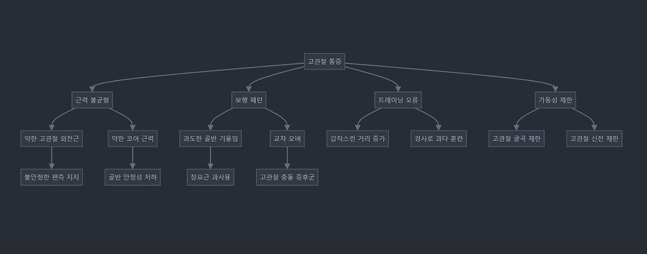다른 원인인 근력 불균형, 과도한 트레이닝, 가동성 제한 등은 반복되는 내용들이다. 보강 운동이나 워밍업이나 쿨다운 스트레칭으로 달릴 수 있는 몸을 만들고 유지해야 한다. 그리고 언제나 과유불급.