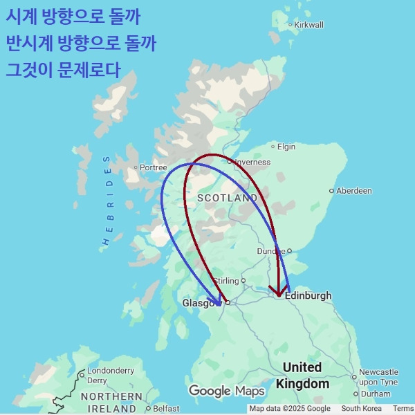 이 경우 나의 여행의 끝은 8월의 에딘버러로 정해졌으므로 시계 방향으로 돌아야 했다. 즉 글라스고 in, 에딘버러 out이다. 좋아, 이 정도면 내 기준 계획 다 짠 거다. 이제 가기만 하면 된다!