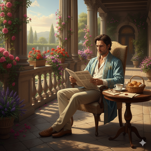 세르비카 경은 테라스에서 아침을 들며 신문을 읽고 있었다.