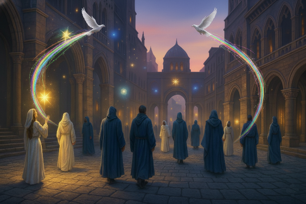 눈부신 흰 옷을 입은 사람들은 세라비 일행을 도시 안쪽 깊은 곳으로 데리고 갔다. 세라비는 그들을 따라가며 템푸스 아르카의 거리를 경이로운 눈으로 바라보았다. 넓은 거리와 광장에는 네 명의 남녀와 같은 흰 옷이나 푸른색 등 여러 가지 색의 로브를 입은 사람들이 지나다니고 있었다. 바닥도 건물도 모두 돌로 만들어진 도시는 전체적인 색조가 어두운 편인데도 불구하고 따뜻하고 환하게 빛나고 있었다.
