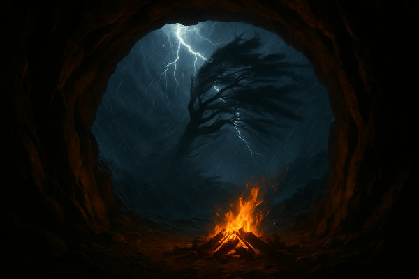 한밤중에 세라비가 눈을 떠 보니 동굴 밖에는 폭우가 내리고 있었다. 첼레는 동굴 입구에 서서 폭풍에 큰 나뭇가지들이 날아다니는 것을 구경하고 있었다. 번쩍 하고 번개가 어딘가에 떨어지더니, 바로 이어 하늘을 두 쪽 낼 것 같은 천둥소리가 천지를 찢었다. 높은 산에서 만나는 천둥과 번개는 지상의 그것과는 차원이 달랐다. 세라비는 무서워 떨고 있는 플로르 왕자에게 담요를 둘러주고 꼭 안아 주었다.
