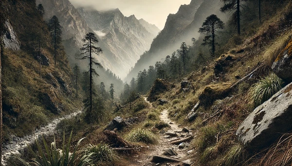 그들은 촌장과 마을 사람들의 따뜻한 배웅을 받으며, 차가운 안개가 내려앉은 고산 지대의 이른 아침 브뤼메 산맥의 골짜기로 이어지는 좁은 오솔길을 걷기 시작했다. 완만하던 숲길은 사람의 흔적이 옅어지며 차츰 거칠어졌고 점점 가파르게 위로 향했다. 안개로 인해 앞이 잘 보이지 않는 골짜기도, 첼레는 매우 익숙한 듯이 무거운 짐까지 지고 잘도 걸어갔다.