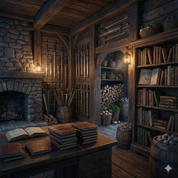 검이 걸려있지 않은 다른 한쪽 벽은 검술과 약초 관련 책으로 가득했다. 그러나 세라비는 그 안에 ‘고산지대 약초로 만드는 요리책’ 이라던가 ‘나만의 약초 정원 가꾸기’와 같은 책들도 있는 것을 발견하고 약간 당황했다.