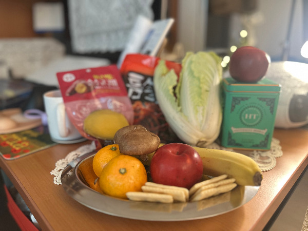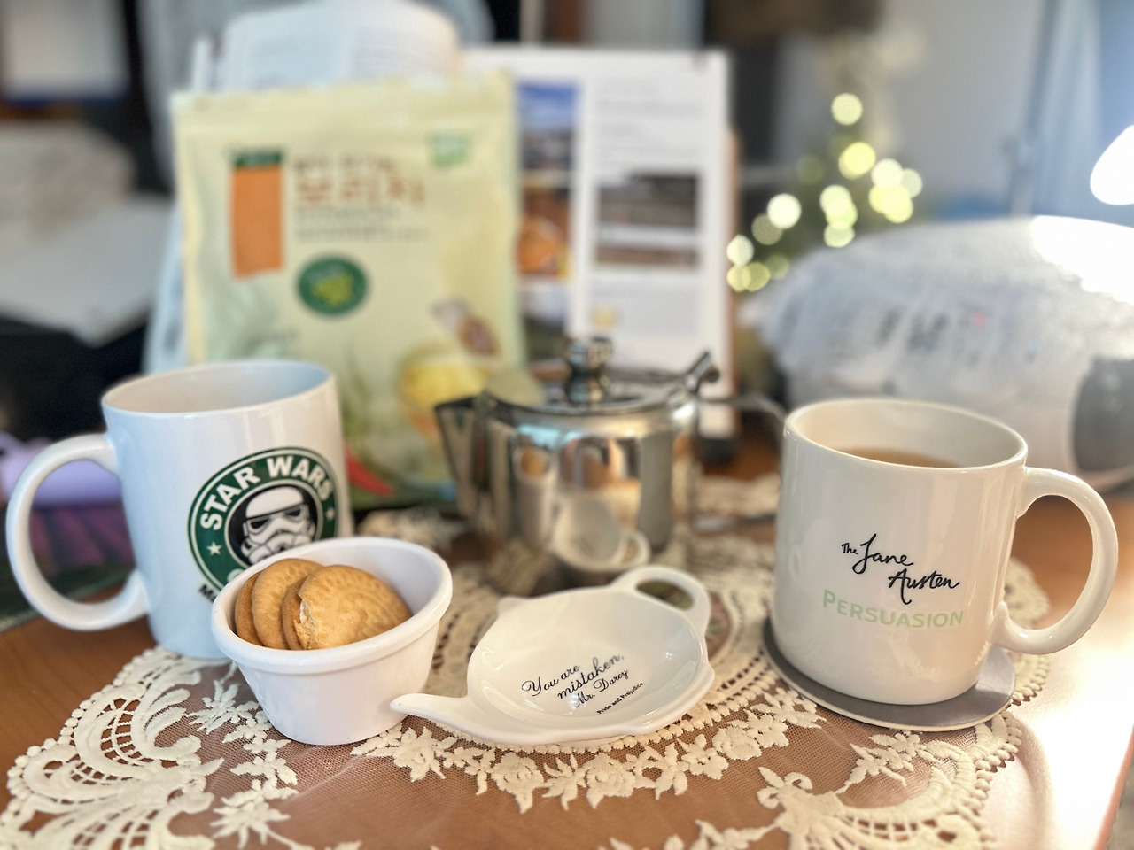 배경: 담터 보리차, 어딘가에서 산 레이스 깔개(3500원)