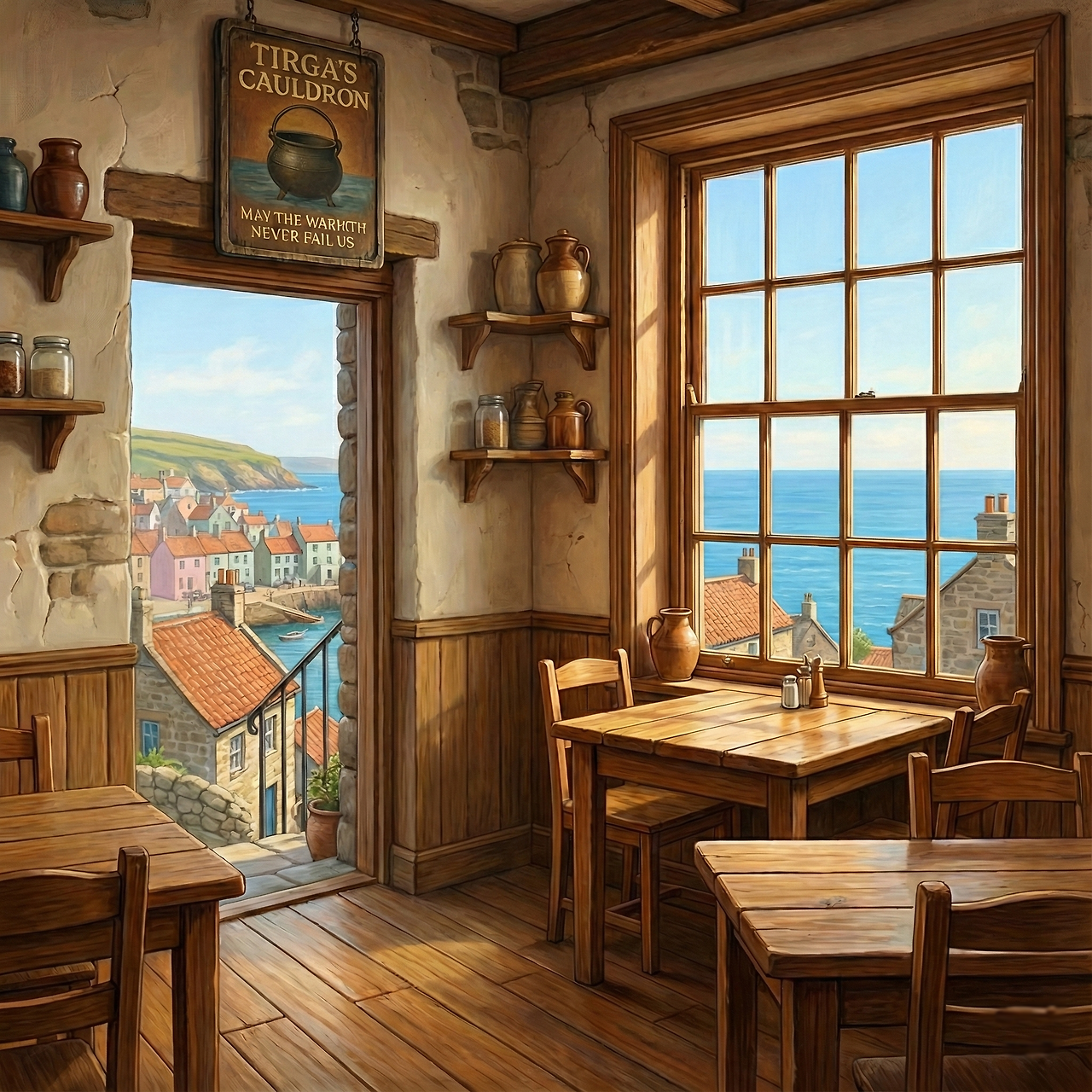 사실 이런 화창한 날씨를 본 적은 없지만(아 진짜 거기서 지낸 시간 중 10분 정도만 빼고 계속 흐리고 비만 왔다) 아마도 날씨가 좋은 날의 풍경은 이렇지 않을까? 글도 안 쓰는 주제에 이미지부터 그리고 있는 나는 '티르 타라글렌의 평화로운 나날들(지금 쓰는 소설 제목 스포)'에 나오는 식당 '티르가의 솥' 내부에서 본 풍경을 이렇게 그렸다. 이런 모습의 포트리에 가보게 될 날을 기다리는 마음으로.