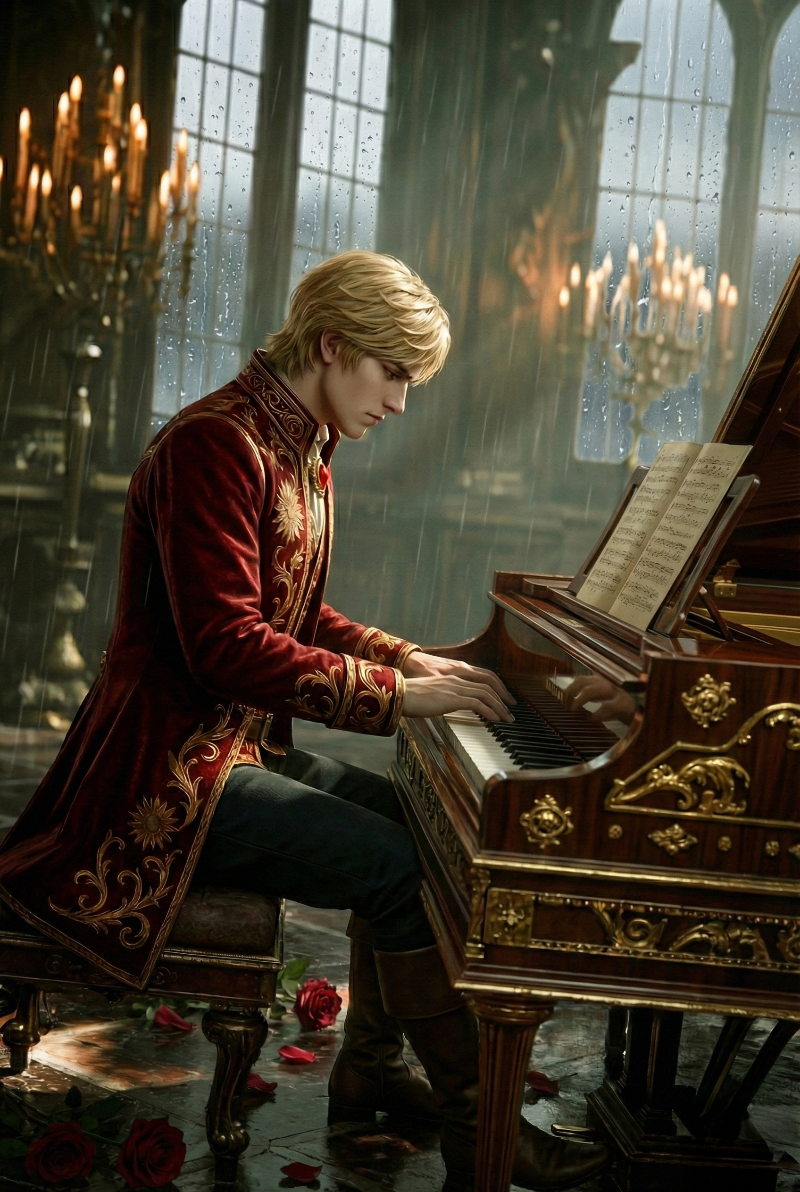 화보집 스타일 좋아하는 AI가 고악기라고 하니까 신이 나서 하프시코드 여기저기에 얼룩에 곰팡이까지 그려놨길래 때 빼고 광 내고 바닥에 장미꽃 깔고 창밖에 비 내리게 하면서 여러 번 수정한 작업입니다.