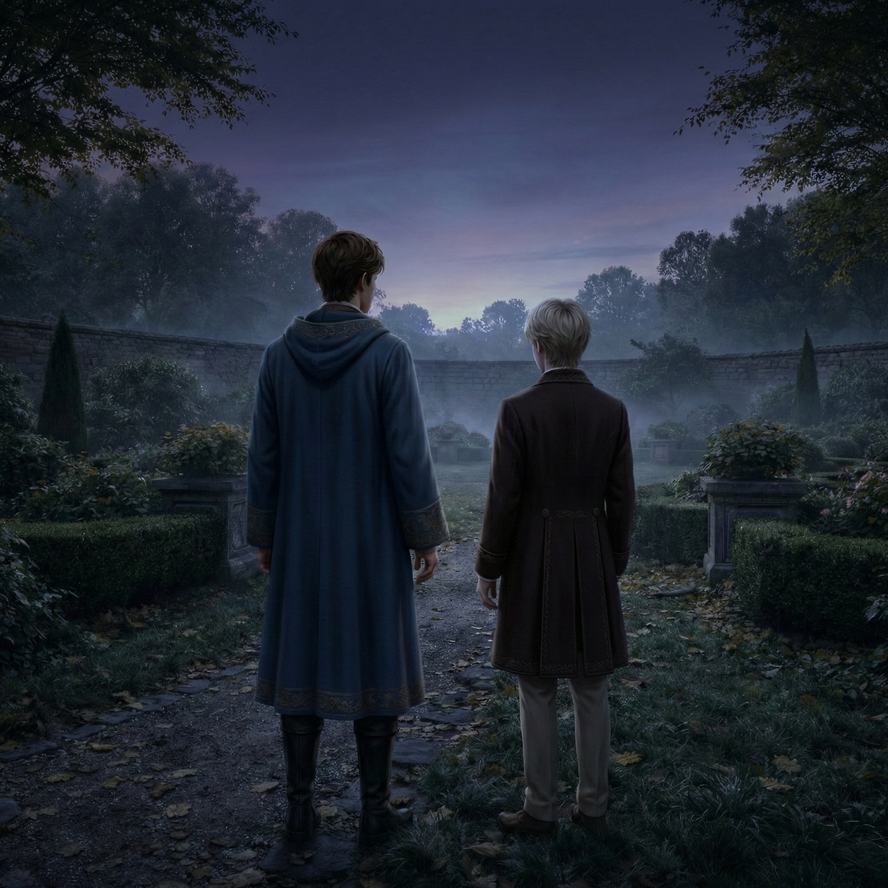 이른 가을 새벽, 안개 낀 정원에서 레이와 플로르가 나란히 서서 같은 방향을 바라보는 뒷모습. ⓒ Mabon / AI