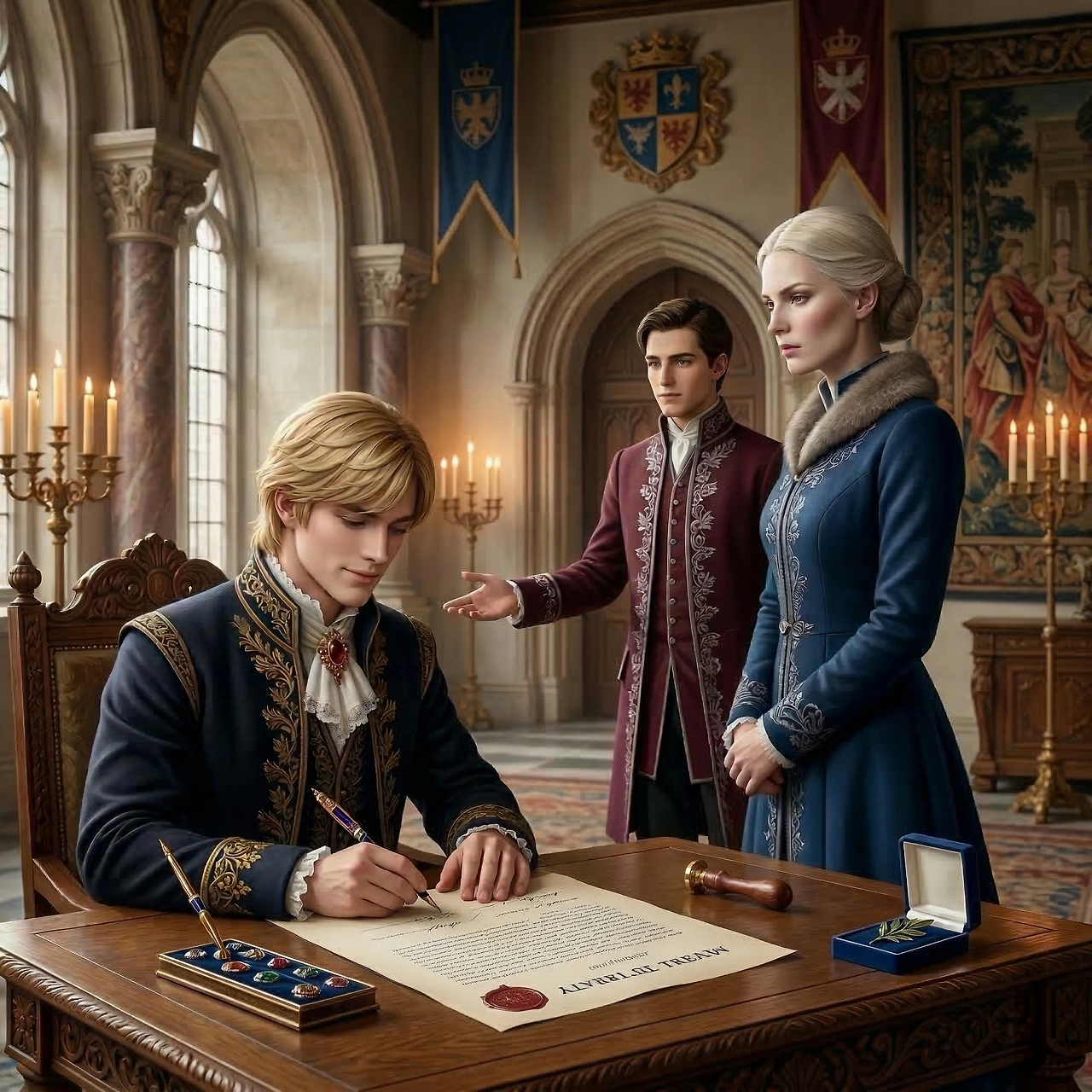 게로스는 국혼 수락 문서에 조용히 서명했다. 국왕의 인장으로 밀봉된 봉투에는 ‘왕의 고결한 뜻’이라고 알티스 문자로 적혀 있었다. 곧이어 게로스가 방금 서명할 때 사용한 왕가의 보석이 박힌 펜과 올리브 잎을 새긴 브로치가 푸른 벨벳으로 감싼 상자에 담겼다.