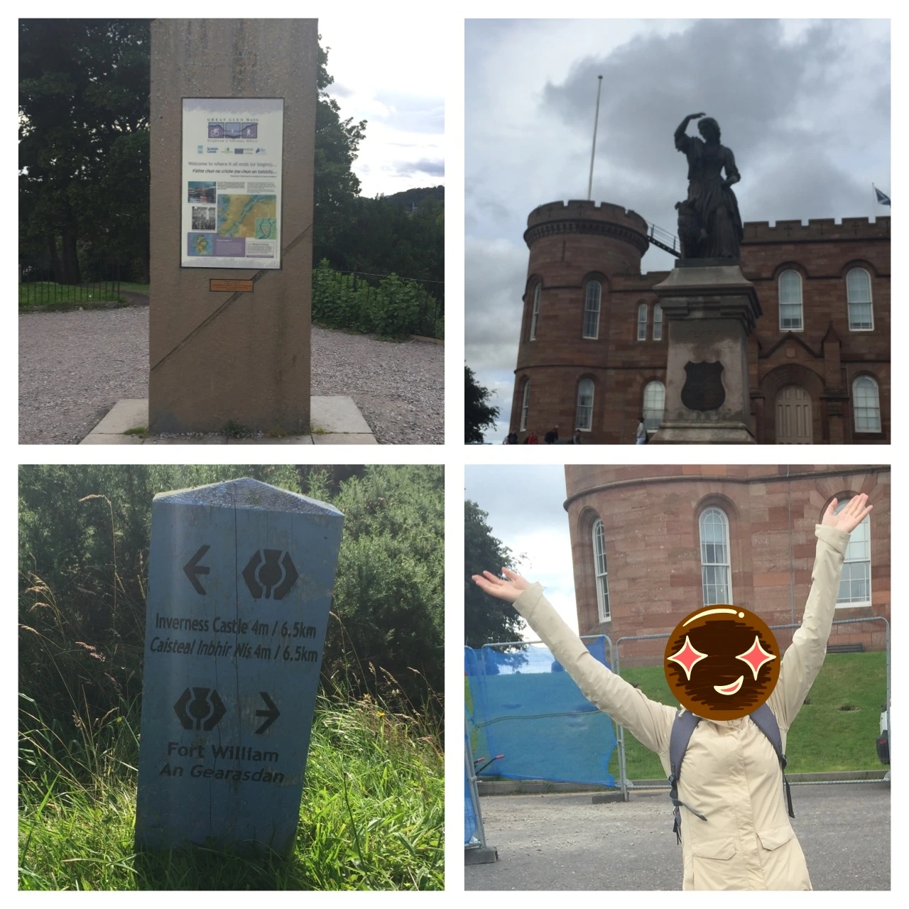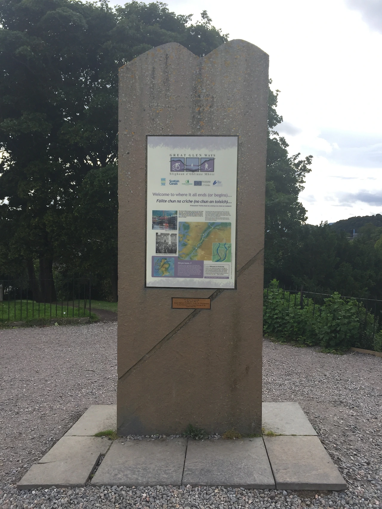 인버네스 성 앞뜰에는 그레이트 글렌 웨이 완주(혹은 시작) 기념비(?)가 서 있었다. 여기 도착하면 크고 화려한 축하 표지판과 마치 마라톤 완주자들을 보고 환호하듯 사람들과 하이파이브하는 세리머니가 있을 줄 알았다. 그리고 엄청난 완주자 방명록에 김마봉 프롬 싸우쓰 코리아! 라고 내 이름을 멋지게 써놓고 역시 사람들의 환호와 함께 기념사진을 찍을 줄 알았는데 막상 와보니 소래포구 꽃게동상보다 더 소박하고 썰렁한 저 기념비 같은 거만 딸랑 있었다. 그나마도 아무것도 없어서 여기저기 성 앞뜰을 돌아다니다가 겨우 찾은 게 저거였다. 기념비에는 이렇게 쓰여 있었다.
