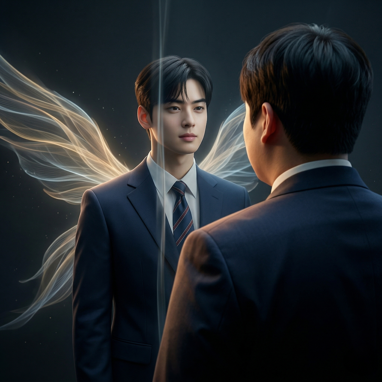 꿈속에서 누군가가 다정한 목소리로 말하며 그의 앞에 거울을 가져다 놓는다. 발음에 꼬부랑 말투가 섞인 걸로 보아 교포인 것 같다. 이상하다, 나는 교포 중에 아는 사람 하나도 없는데. 아무래도 상관없다. 거울 속에는 차은*처럼 이목구비 대칭이 수학적으로 완벽한 잘생남이 서 있다. 등 뒤에는 천사처럼 날개가 펄럭인다. 그는 하늘을 날 수 있다. 하지만 나는 건 좀 이따 하고 거울부터 본다. 그게 더 중요하다.