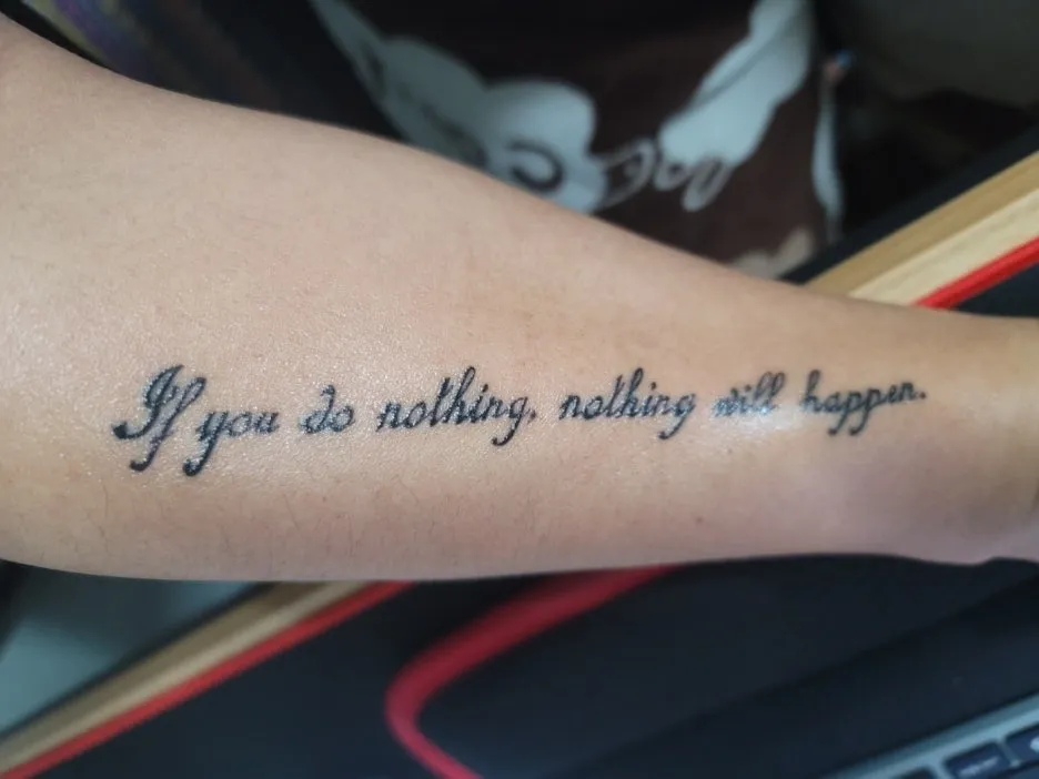 이 문장은 내가 인생의 좌우명으로 선택한 문장으로 얼마 전 앞으로 평생 이 문장의 의미를 신념으로 살기 위해 팔목에 새긴 문장 <If you do nothing, nothing will happen.> “아무것도 하지 않으면, 아무 일도 일어나지 않는다”와 같은 의미를 가진 문장이었다.
