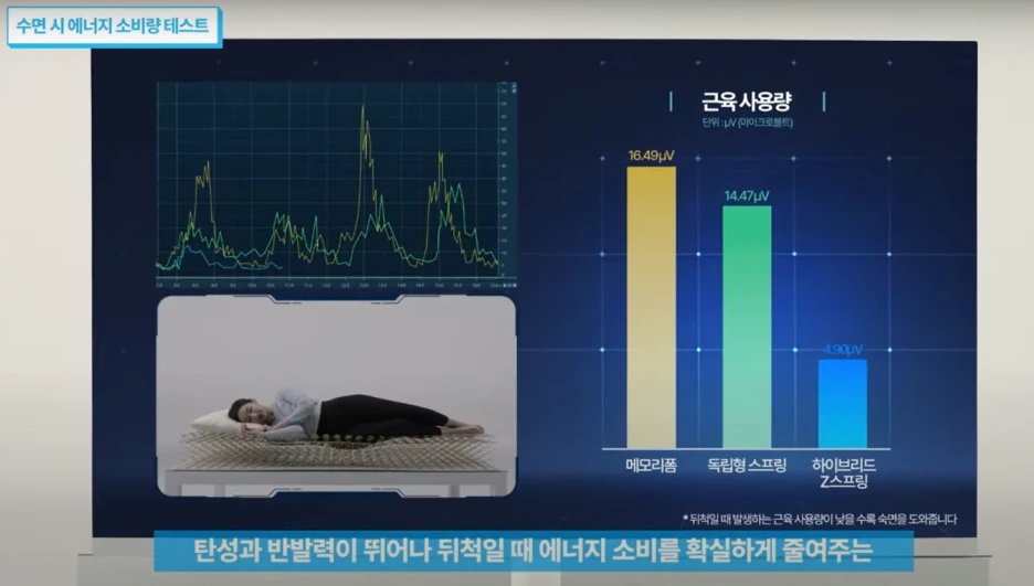 광고는 이 질문을 던지며, 흥미로운 실험을 보여주었다. 잠을 자는 동안 몸을 좌우로 뒤척일 때, 조금이라도 더 쉽게 움직일 수 있도록 침대의 스프링 구조가 설계되어 있다는 내용. 단순한 편안함이 아니라, ‘수면 중 에너지 소비’라는 개념을 접목한 점이 인상적이었다.