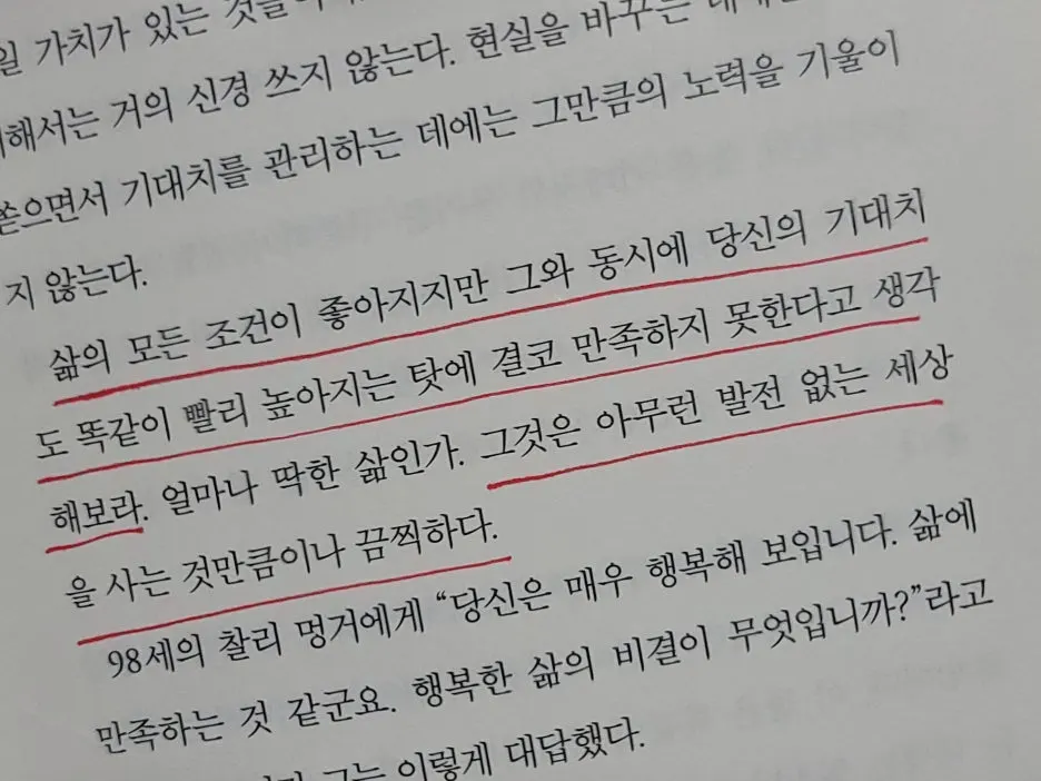 삶의 조건이 조금씩 좋아질수록 우리의 기대는 더 높아진다. 그 기대가 만족을 삼켜버릴 때 우리는 스스로 불행을 키운다. 불변의 법칙은 어쩌면 단순하다.