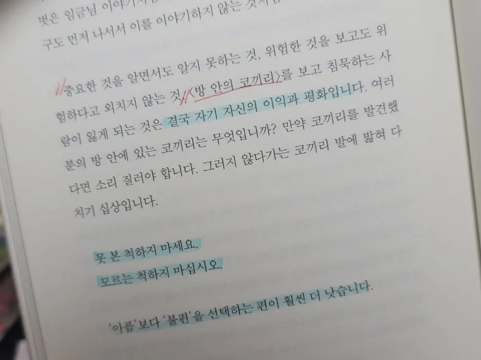 “중요한 것을 알면서도 알지 못하는 것, 위험한 것을 위험하다고 외치지 않는 것, <방 안의 코끼리>를 보고 침묵하는 사람이 잃게 되는 것은 결국 자기 자신의 이익과 평화입니다.