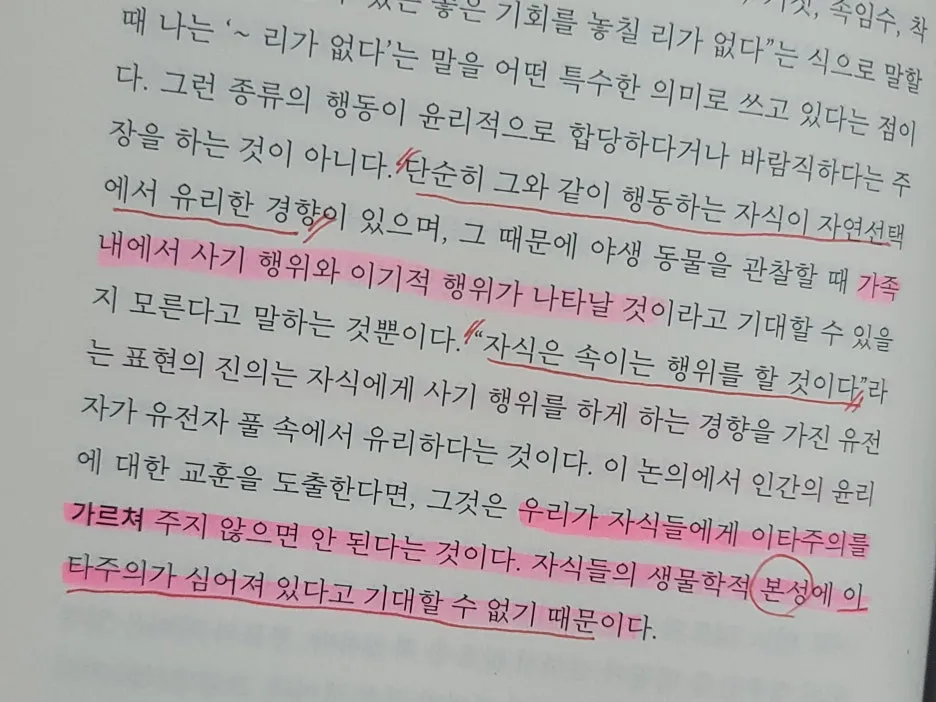 그러나 나는 이 설명에서 이상한 위로를 받는다. 타고난 본성이 이기적이라면 나는 스스로에게 너무 많은 도덕적 잣대를 들이대며 살아온 것은 아닐까?