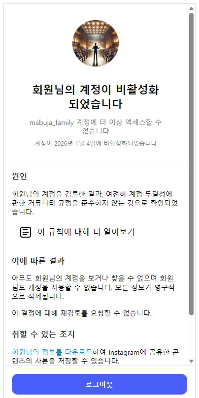 인스타를 생활도구로 쓰고 있는 막내에게 도움을 요청했다. 돌아온 대답은 더욱 짧고 강력했다. “영구 비활성화는 복구 방법이 없다네요....”라는 말이 오전을 정리했다.