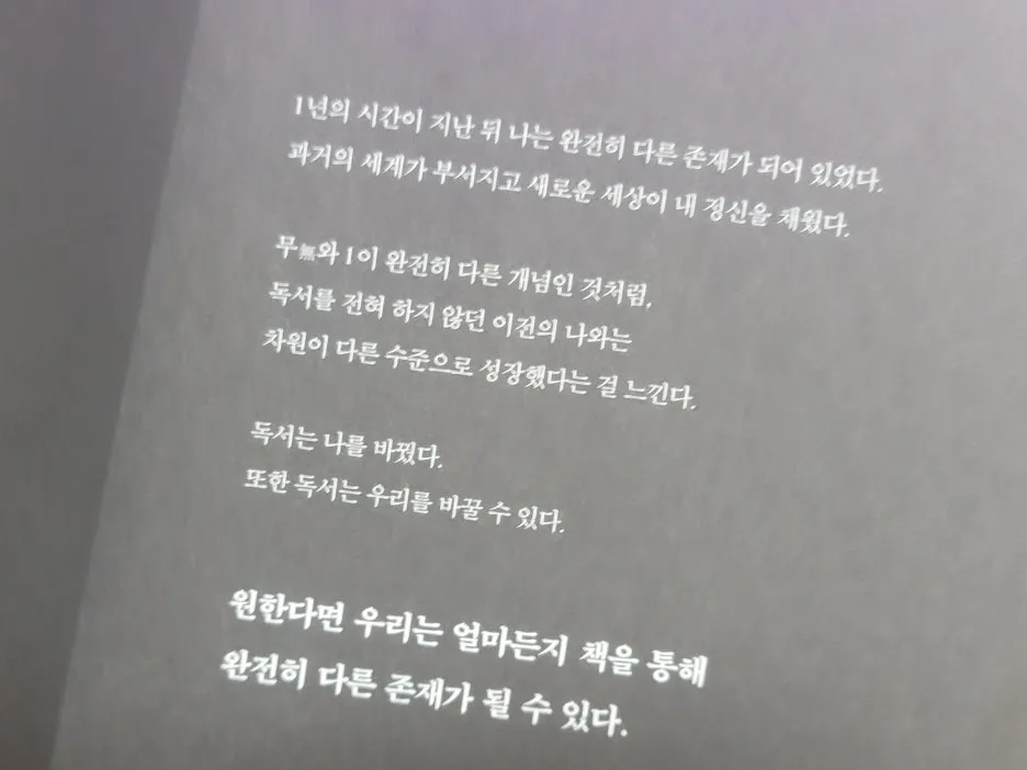 무(無)와 1이 완전히 다른 개념인 것처럼, 독서를 전혀 하지 않던 이전의 나와는 차원이 다른 수준으로 성장했다는 걸 느낀다.