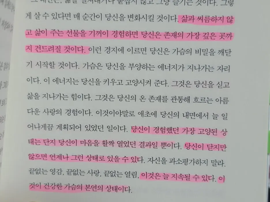책이 말하는 끝없는 영감과 끝없는 사랑과 끝없는 열림은 이상적인 문장이 아니다. 그것은 건강한 가슴이 본래 지닌 상태라는 설명으로 다가온다.