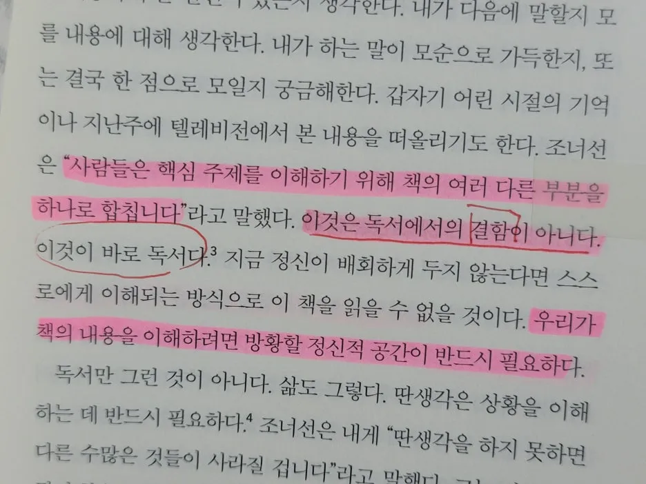 이 문장을 읽으며 집중을 방해한다고 여겨왔던 방황이 오히려 이해를 가능하게 만드는 조건이라는 말은 내 독서 경험을 전혀 다른 각도에서 다시 바라보게 만들었다.