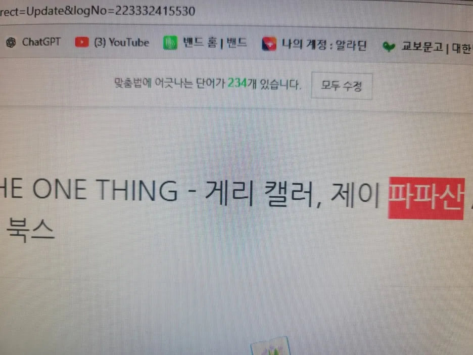 혹시나 싶어 맞춤법 검사기를 돌려보았다. 결과는 충격적이었다. 무려 234개의 맞춤법 오류. 한 문장 한 문장, 나름의 감동과 깨달음을 담으려 했던 당시의 글은 어긋난 표현들로 가득했다. 그런 글을 누군가 읽고 공감해 주길 바랐던 나 자신이 갑자기 초라하게 느껴졌다. 내가 얼마나 부족했는지를 마주하는 순간은 예상보다 묵직하게 다가왔다.