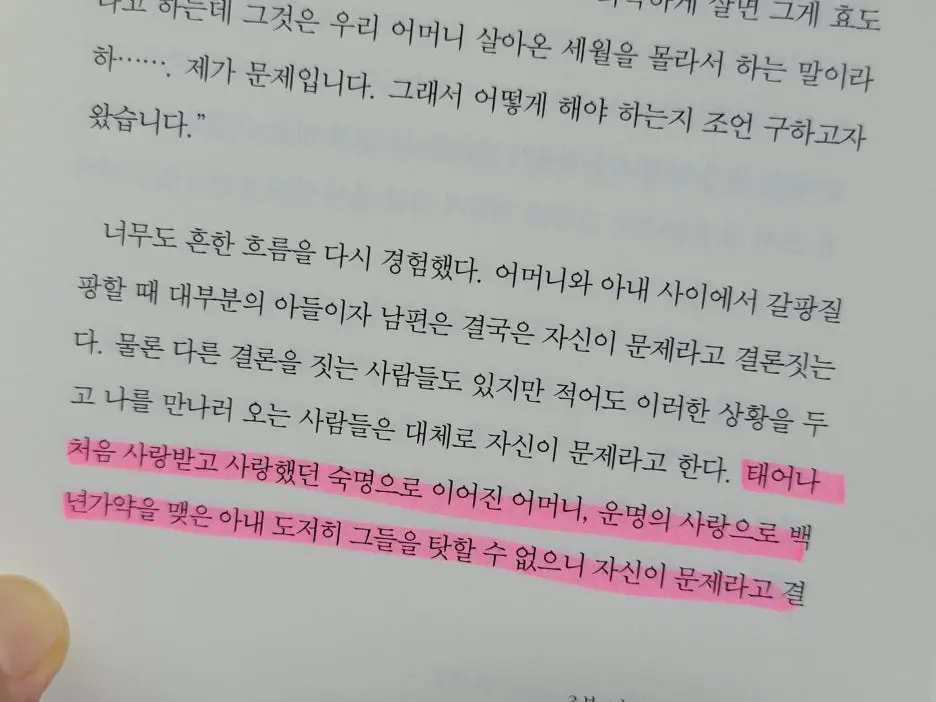 그 문장 속의 인물은 어머니도 아내도 탓하지 못한다. 사랑했던 사람들이기에 그들을 향해 분노를 돌릴 수 없다. 그래서 화살은 자신에게 향한다. 자신이 문제라고 결론짓는 것이 최선처럼 보인다.