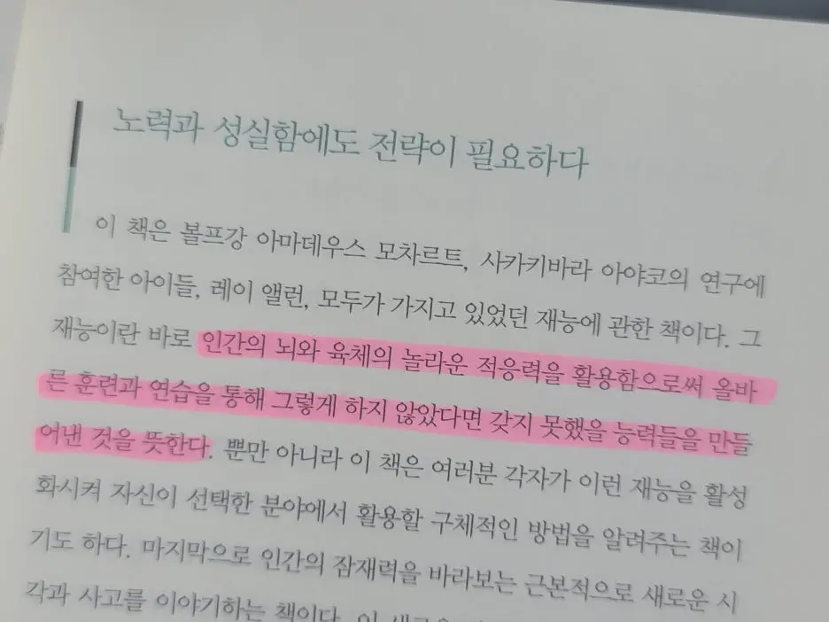 “그 재능이란 바로 인간의 뇌와 육체의 놀라운 적응력을 활용함으로써 올바른 훈련과 연습을 통해 그렇게 하지 않았다면 갖지 못했을 능력들을 만들어낸 것을 뜻한다.”