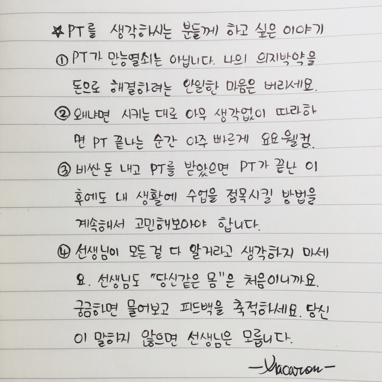 또한 내가 얻고자 하는 바를 PT에서 얻기 위해서 난 어떤 선생님을 찾아야 하는지에 대해서는 고민을 하고 결정해보셨으면 해요.