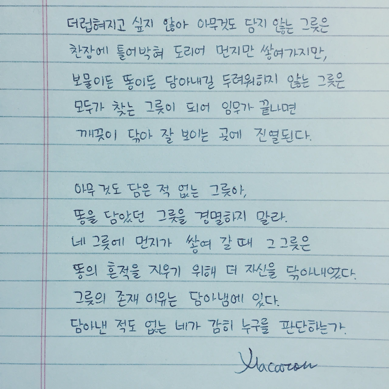 흰 보자기는 아무 물건이나 품을 수 없다.난 차라리 검게 물들어서 뭐든 가리지 않고 품을 수 있는 검은 보자기가 되고 싶다.행여 물건이 그 안에서 금이 가 내용물이 새어나와도 티내지 않고 깨진 것까지 가만히 품을 수 있는.