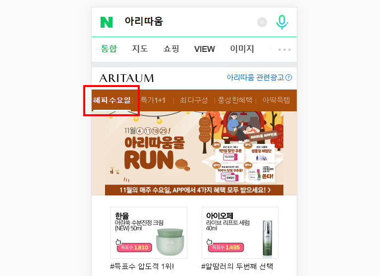 네이버 모바일에 노출된 아리따움 광고 영역