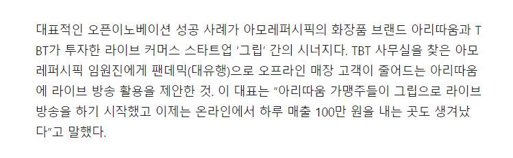 코로나로 인한 비대면의 쓰나미로 '라이브 커머스'가 큰 인기를 얻고 있습니다. 위 기사에서 언급된 바, 아리따움이 라이브 커머스 플랫폼인 '그립'에 투자한 이유도 같은 맥락입니다. 상상해볼까요? 현 시안. 상단부에 섹션을 하나두어 그립내 아리따움 제품을 홍보하는 라이브 방송을 노출시키는 상황을 말이죠. 아리따움 측은 라이브 커머스 콘텐츠를 얻고, 그립 측은 아리따움 사이트를 통해 그들의 서비스를 홍보할 수 있죠. 서로가 윈윈 하는 그림이 나옵니다.