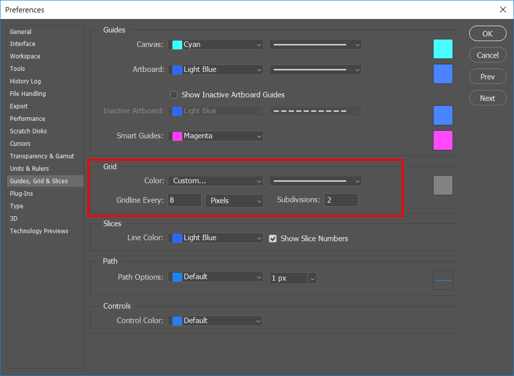 시간 나실 때 공부해 보시거나 실무에 적용해보세요. 좋은 경험이 될 거라 생각합니다. 포토샵에서 적용하는 방법도 생각보다 쉽습니다. Preferences > Grid관련 메뉴로 진입해 해당 수치 값을 아래와 같이 바꿔준 후, Ctrl + '(따옴표)를 눌러 그리드를 켜고 작업하면 됩니다. 8이 최소 단위로 크다 생각되면 4를 최소 단위로 사용해도 됩니다. 4도 결국 정수로 나눠지니까요.