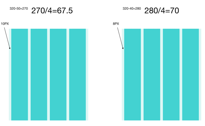 먼저 용어적 혼선부터 해결합니다. 많은 디자이너와 인터넷 강의를 하는 자들이 유닛과 컬럼을 혼동합니다. 붉은색으로 처리한 부분이 유닛이며 유닛과 거터를 포함 세트 단위가 컬럼입니다. 이 역시 기준 단위를 8로 만들었습니다. 최소 단위의 디스플레이라 축소할 일은 없지만 혹 축소해도 정수로 떨어지며 깨지지 않습니다. 물론 거터 값이 작다 느껴지면 8로 설정되어 있는 거터를 16으로 바꿔 설정해도 됩니다. 요즘 모바일은 360에 4컬럼 또는 6컬럼 작업 많이 합니다. 특별한 경우를 제외하고 가능하다면 그리드 시스템이 익숙해지는 시점까지 기본기 유지를 위해 320으로 세팅한 후 양 사이드 마진을 조절해가며 360에 대응할 것을 권장합니다. 1~2번만 실무에 적용해보면 감이 옵니다. 회사에서 360으로 해야한다하면 그리하세요. 단 숫자 8을 잊으면 안 됩니다.