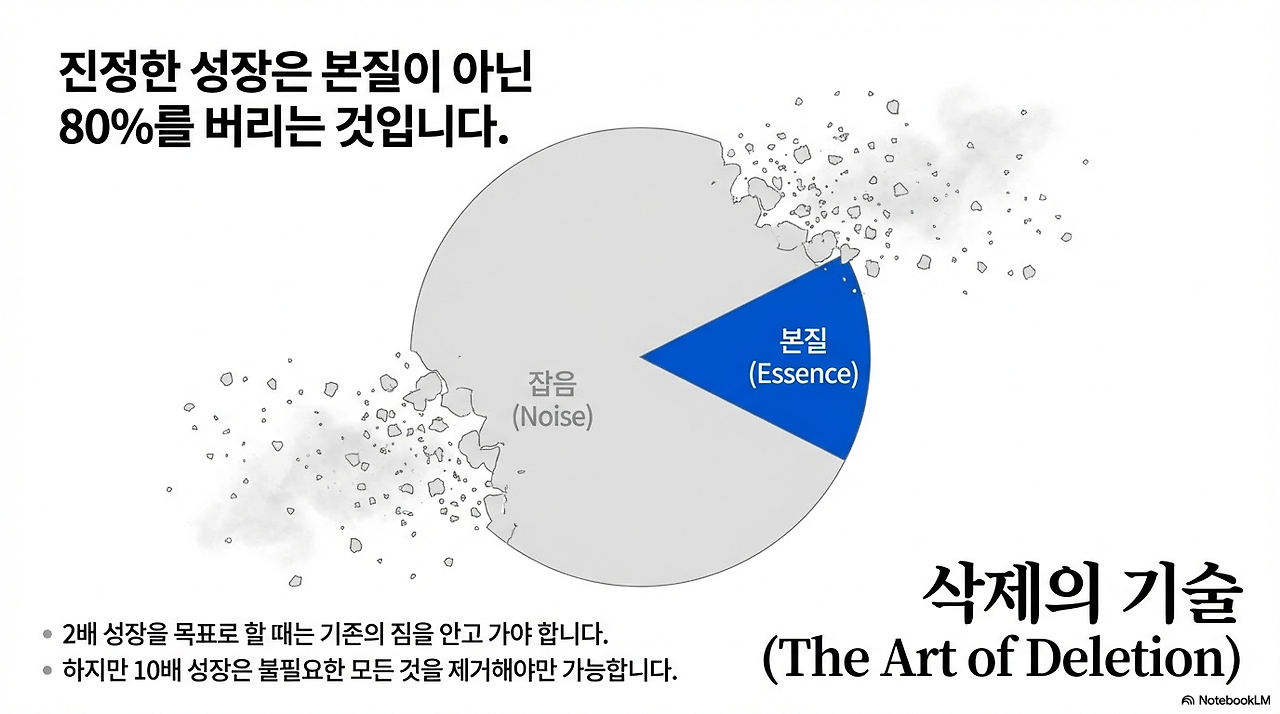 우리는 흔히 성공을 위해 더 많은 것을 채워야 한다고 배운다. 더 많은 지식, 더 많은 인맥, 더 많은 업무 시간. 하지만 벤저민 하디와 댄 설리반의 저서 '10배 마인드셋'은 이 익숙한 성공의 방정식을 정면으로 부정한다. 이 책을 통해 내가 발견한 진리는 명확하다. 진정한 성장은 무언가를 더하는 것이 아니라, 본질이 아닌 80%를 과감히 덜어내는 '삭제의 기술'에 있다는 것이다.
