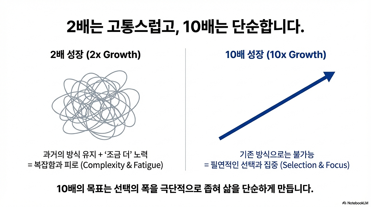 첫 번째 나의 인사이트는 '단순함이 주는 강력한 힘'이다. 흔히 10배라는 목표는 2배보다 훨씬 고통스럽고 복잡할 것이라 짐작한다. 그러나 역설적이게도 10배의 목표는 선택의 폭을 극단적으로 좁혀 삶을 단순하게 만든다. 2배 성장은 과거의 방식을 유지하며 '조금 더' 노력하면 가능하지만, 10배 성장은 기존의 방식으로는 절대 도달할 수 없다. 그렇기에 우리는 필연적으로 주변의 수많은 '잡음(Noise)'을 차단하고, 오직 목표로 향하는 단 하나의 길에만 집중하게 된다. 적은 것이 더 많다(Less is More)는 철학은, 단순한 효율성을 넘어 극도의 명쾌함이 주는 자유를 선사한다.