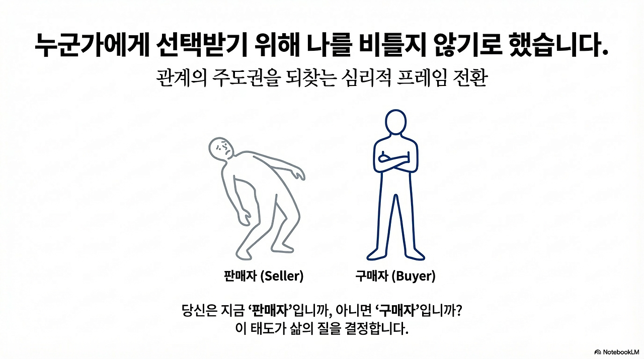 두 번째 통찰은 '관계의 주도권'에 관한 것이다. 책에서 언급된 구매자와 판매자의 비유는 삶을 대하는 태도를 뿌리부터 흔들어 놓는다. 누군가에게 선택받기 위해 자신의 기준을 낮추고 비트는 '판매자'의 삶은 늘 절박하고 피로하다. 반면, 자신만의 명확한 기준을 가지고 필요하다면 언제든 거절할 수 있는 '구매자'의 삶은 자율적이다. 이는 조직 관리에서도 마찬가지다. 세세한 통제로 타인을 억압하는 대신, 명확한 비전을 공유하고 주도적으로 일하는 이들을 신뢰하는 것. 그것이 바로 관계에서의 심리적 우위를 확보하고 함께 성장하는 진정한 리더십의 본질이다.