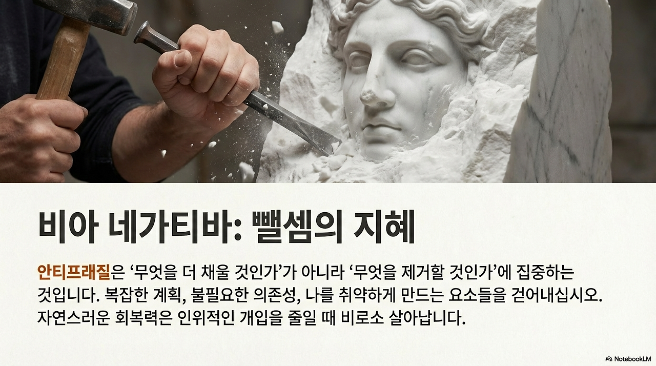 더불어 안티프래질이란 '무엇을 더 채울 것인가'가 아니라 '무엇을 제거할 것인가(비아 네가티바, Via Negativa)'에 집중하는 지혜다. 안전하다고 느끼게 만들어 줄 복잡한 계획과 불필요한 의존성을 걷어낼 때, 우리는 비로소 자연스러운 안티프래질리티를 회복할 수 있다.