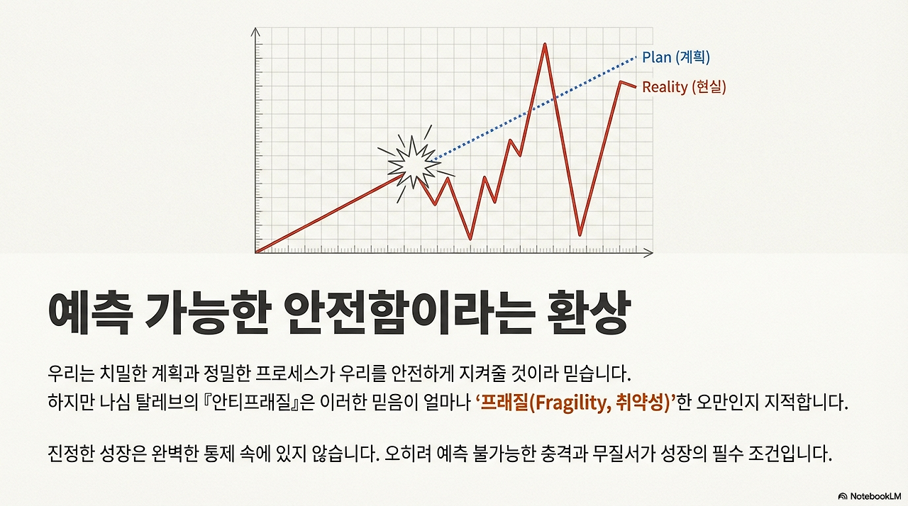 세상은 예측 가능한 선 위를 달리지 않는다. 흔히 치밀한 계획과 정밀한 프로세스가 우리를 안전하게 지켜줄 것이라 믿지만, 나심 탈레브의 저서 '안티프래질'은 그 믿음이 얼마나 '프래질(Fragility, 취약성)'한 오만인지 날카롭게 지적한다. 이 책을 통해 얻은 가장 큰 깨달음은 명확하다. 진정한 성장은 완벽한 통제가 아니라, 오히려 예측 불가능한 충격과 무질서 속에서 꽃피운다는 사실이다.