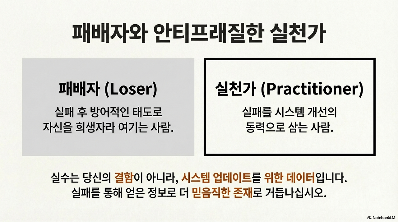 또한, 실패를 대하는 태도에서 '패배자(Loser)'와 '안티프래질한 실천가'를 구분하게 되었다. 실패 후 방어적인 태도로 자신을 희생자라 여기는 사람은 패배하지만, 실패를 통해 얻은 데이터를 시스템 개선의 동력으로 삼는 자는 더욱 믿음직한 존재로 거듭난다. 진보는 기존 시스템에 찌든 노련함이 아니라, 잃을 것이 없는 젊은 용기와 미숙한 아이디어의 프래질함 속에서 싹트는 법이다.