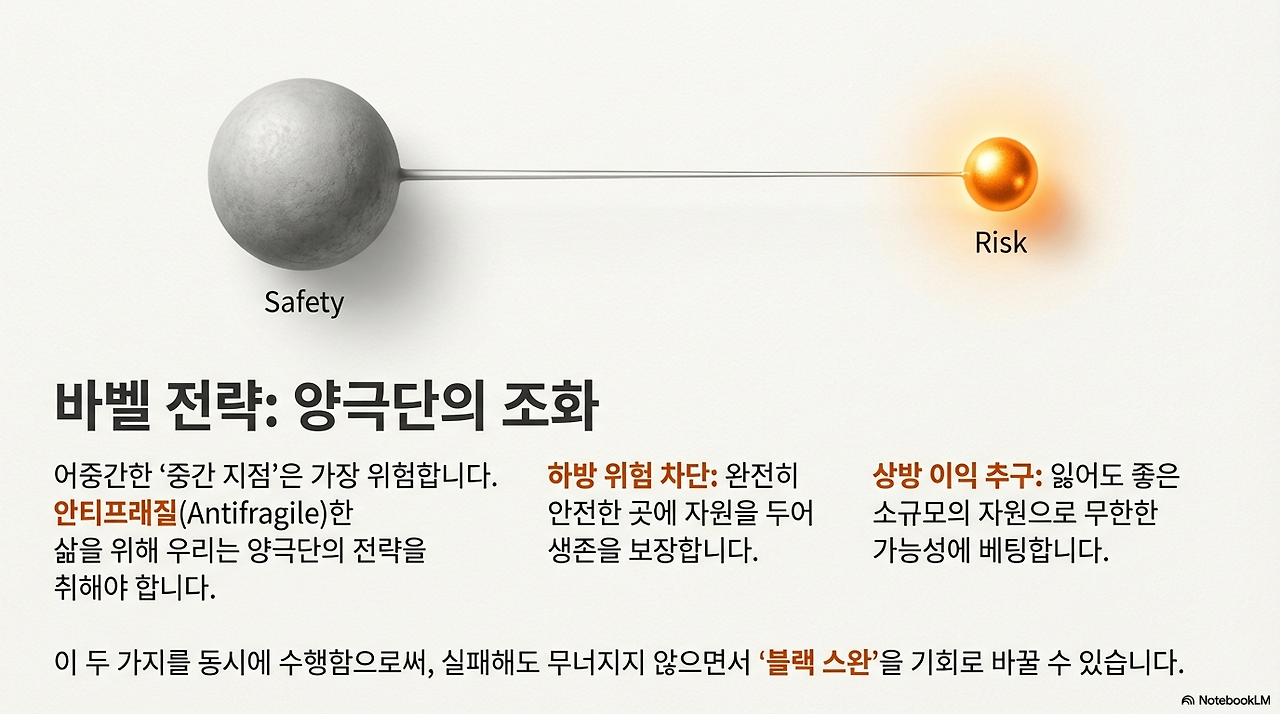 안티프래질적 접근법 중 하나로 '바벨 전략'에 있다. 이는 양극단 전략을 취함으로써 하방 위험은 최소한으로 막고 상방 이익은 무한히 열어두는 것이다. 90%의 자원을 안전한 기반 위에 두어 생존을 보장하고, 나머지 10%를 도전적인 영역(예: 소설 집필, 콘텐츠 제작, 새로운 기술 학습 등)에 투자하는 방식이다. 성공은 비대칭성을 야기하여 우리를 잃을 것이 많은 '노예 상태'로 만들기 쉽지만, 바벨 전략은 우리에게 실패해도 무너지지 않을 안전판과 동시에 블랙 스완을 기회로 바꿀 자유를 선사한다.