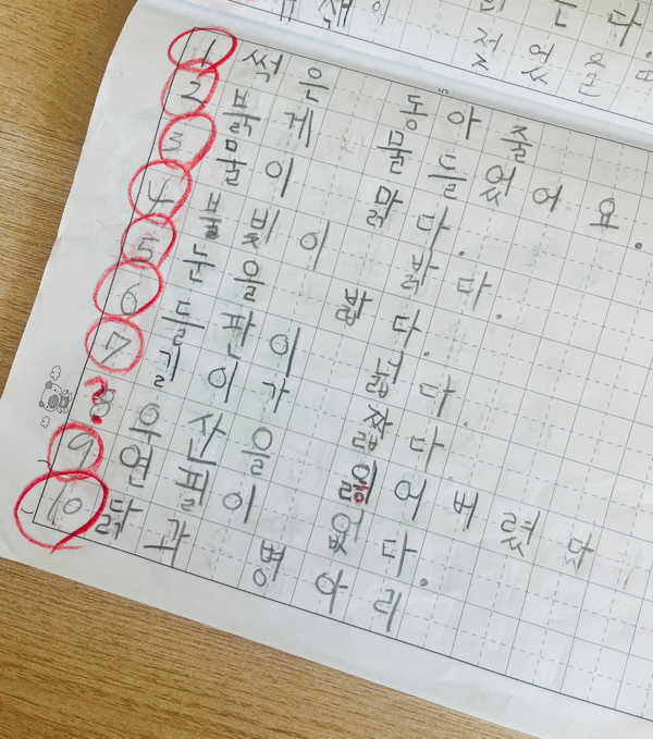 그 후 몇 번의 연습을 더 하고 시험을 보고 온 날, 아이는 한 개 틀린 시험지를 자랑스럽게 내밀었다. 아이를 꼭 안아주며 지난 며칠간 참고 연습한 덕분이라고 말해주었다. 그리고 9점짜리 시험지는 그동안 연습한 종이와 함께 아이 방 문에 붙여놓았다. 방을 지날 때마다 시험지보다 연습한 흔적을 보고 더 뿌듯해했으면 하는 소망과 함께 종이를 붙인 테이프를 다시 한번 꾹꾹 눌렀다.