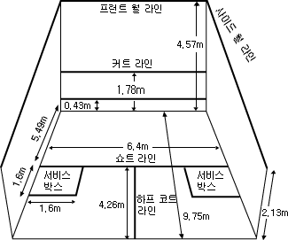 위 그림에 나와있듯이 스쿼시 코트의 넓이는 가로 6.4 미터 x 세로 9.75 미터다. 앞쪽에 있는 공 하나 받고, 상대가 공을 뒤로 보내면 그거 따라가서 받고 나면 벌써 앞뒤로 20여 미터를 뛰는 셈이 된다. 만약 코트를 대각선으로 뛰어가서 이렇게 공을 두어 번 받게 되면 거리는 더 길어지게 된다. 피타고라스의 정리 ㅇㅋ? 스쿼시 게임은 11점짜리 5판 3 선승인데 (국내 동호인 대회는 3판 2승으로 하더라만), 공 하나 받는데 20미터 정도를 뛰어다녀야 하고, 이렇게 점수 내는 것을 11번을 해야 1세트가 끝난다. 사실 스쿼시에서는 '세트'라는 용어 대신에 '게임'이라고 쓰지만 사람들이 알아듣기 쉽게 일단은 '세트'라고 해본다. 그리고 이렇게 해서 3세트를 먼저 이겨야 하는 경기가 스쿼시다. 이게 주욱 달려가는 게 아니라 가다 서다를 반복하고, 낮은 공을 받기 위한 런지까지 해야 하니 같은 거리를 달려도 이런 식으로 뛰어다니면 당연히 더 힘들 수밖에 없다. 이래서 스쿼시는 칼로리 소모가 많아지게 된다!