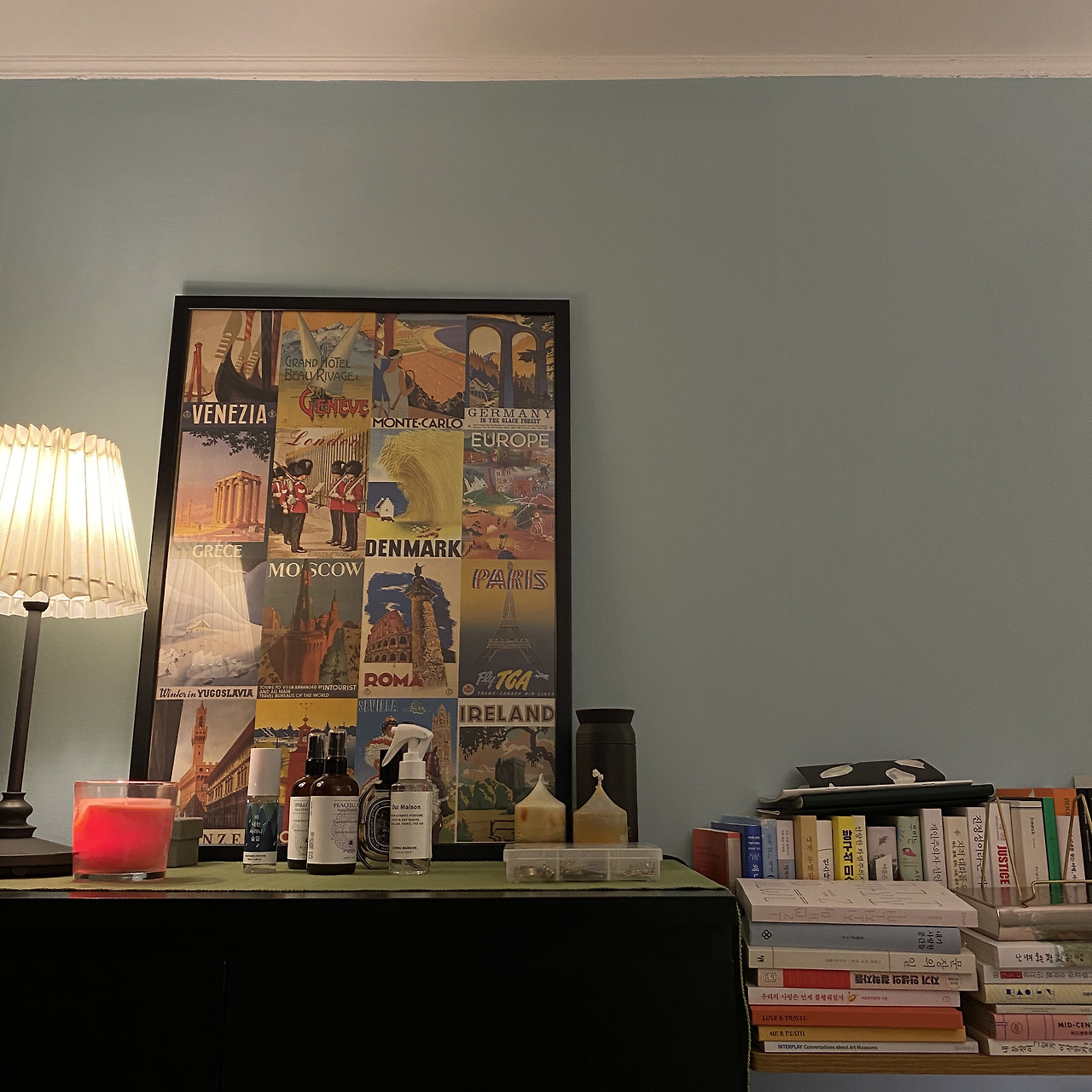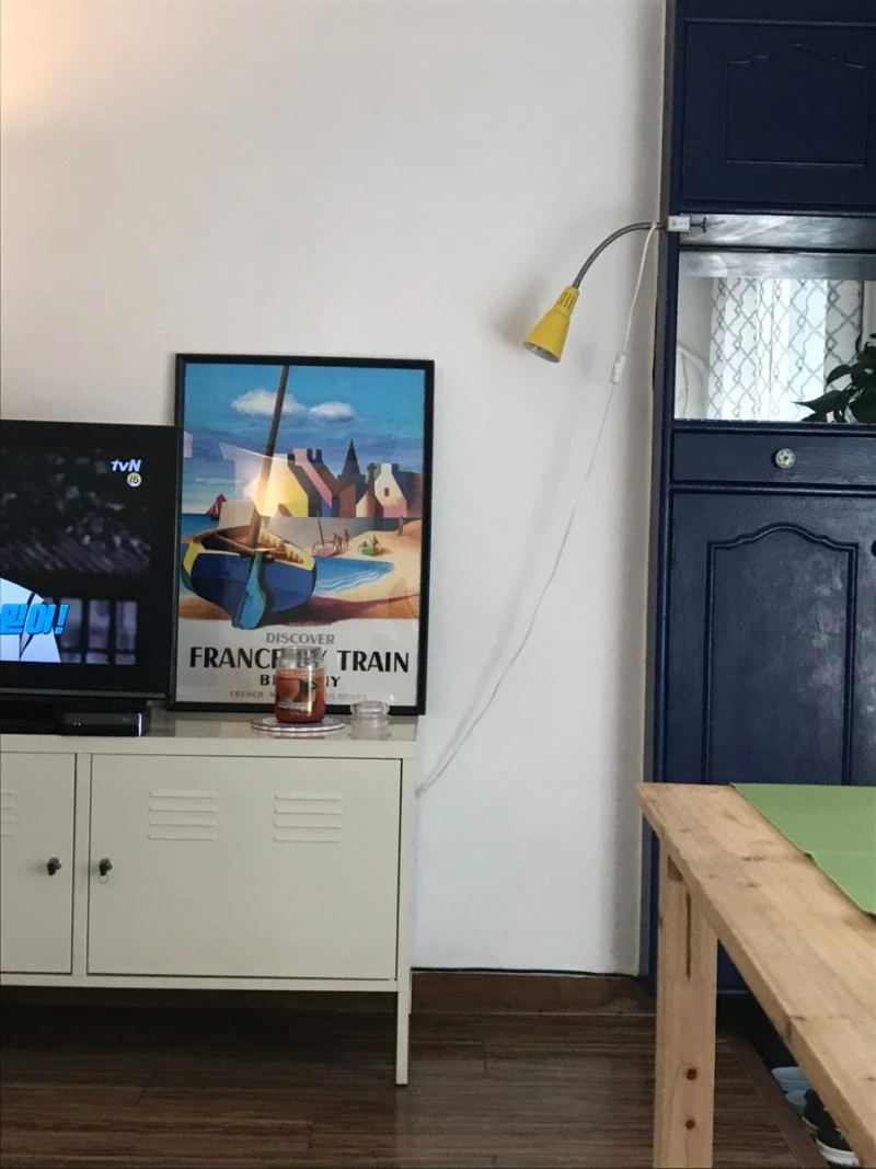 지금 사는 녹사평 집은 작년 2월부터 살았으니 딱 1년이 되었다. 방이 세 개인 집에서 혼자 사는 언니의 방 하나를 빌려 살게 되었다. 문을 열고 들어가 파란색 신발장을 마주친 그 순간 '이런 집에서 살고 싶다' 생각했다. 은은하게 피워둔 향초와 티브이 옆에 무심하게 놓여있던 빈티지 포스터까지 아직도 그 첫 장면이 생생하게 기억이 난다. 바로 그전에 한 참을 걸어 올라갔던 해방촌의 집에서는 플라스틱 서랍장이 들어선 노란 장판의 방을 보고 얼굴을 찡그리고 나왔는데 말이다.