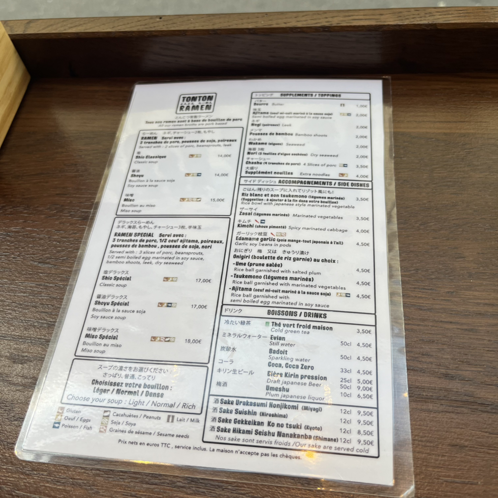 15분 정도 걸어서 도착한 톤톤 라멘. 윌리엄이랑 일본에 갔을 때, 오사카에서 먹은 진한 라멘 국물에 감탄을 했는데, 톤톤 라멘에서도 진한 국물맛을 볼 수 있다고 해서 찾아갔다. 법적으로 프랑스 식당에서는 국물을 오랫동안 우려서 판매할 수 없어, 일본처럼 진하게 우려진 라멘집을 찾기 어렵다고 한다. 나는 시오 스페셜-Léger(레제, 가벼운 국물) 윌리엄은 미소 스페셜-Dense(당스, 진한 국물)로 주문했는데, 여름에는 윌리엄이 주문한 진한 국물 단계 주문이 불가하다고 한다. 아마 더운 날에는 오래 국물을 우려내는게 불가해서 그런가 보다. 결국 Nomarl(노말, 보통 국물)로 주문했지만, 서버분이 셰프에게 부탁해서 진하게 가져다주시겠다고 하신다. 친절한 서버님.