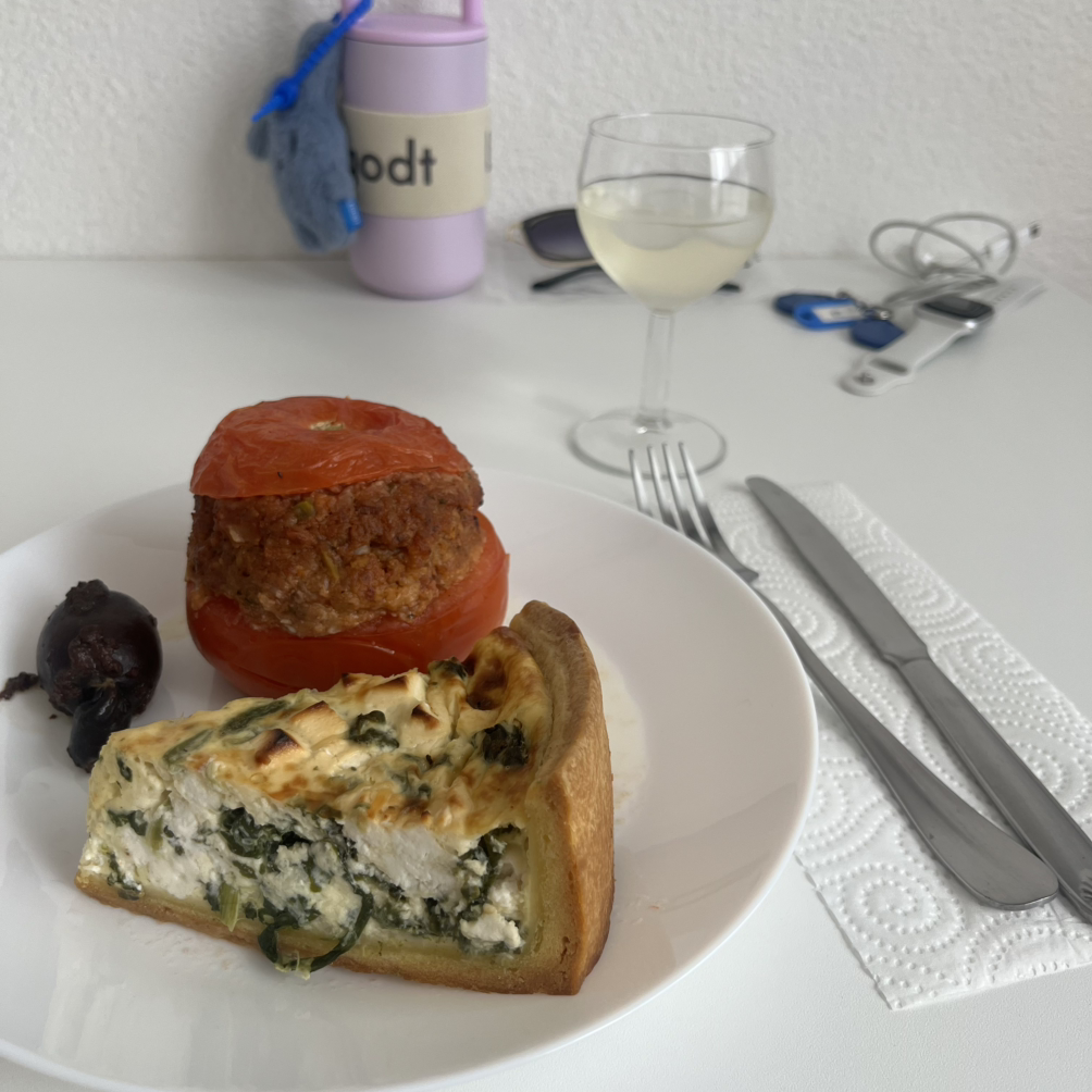 구매한 음식은 키쉬(Quiche, 타르트 반죽에 계란, 치즈, 시금치를 넣고 구운 파이 요리), 토마토 팍시(Tomato farcie, 토마토 안에 양념된 다진 고기를 넣고 구운 요리), 그리고 우리나라 순대와 비슷한 부당(Boudin, 돼지 피와 지방, 양파를 넣어 만든 선지 소지시)이다. 시장에서 저렴하게 구매했지만, 적절하게 간이 되어 세 가지 다 맛있었다. 만족스러운 점심 식사.