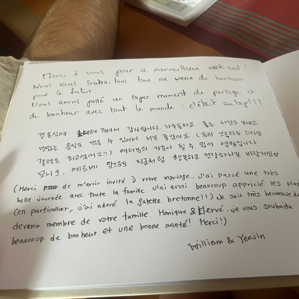 열심히 수영하고, 날이 어둑해져서 다 같이 마당에서 밥 먹음. 셀리아랑 꽁땅이 언제 같이 한국 갈 수 있냐고 그랬다. 내년에는 꼭 같이 한국 가서 이곳저곳 소개해주고 싶다. 프랑스는 가족의 형태가 참 다양한데, 그런 거 개의치 않고 끈끈하게 살아가는 게 새로우면서도 신기하다. 꽁땅도 사실 윌리엄하고 피 한 방울 안 섞인 사인데, 가족처럼 지내고 있다. 옛날에 한국에서 지인분 하고 이런 얘기하면서, 저출산 해결책은 재혼의 유연함이다라고 우스갯소리로 이야기한 적이 있는데 (재혼하면 재혼상대랑도 아이를 나을 확률이 높음으로), 우리나라에서는 이런 가족형태가 받아들여지기까지는 아직 한참은 걸리지 않을까 싶다. 아무튼 이렇게 행복했던 프랑스 결혼식 마무리.