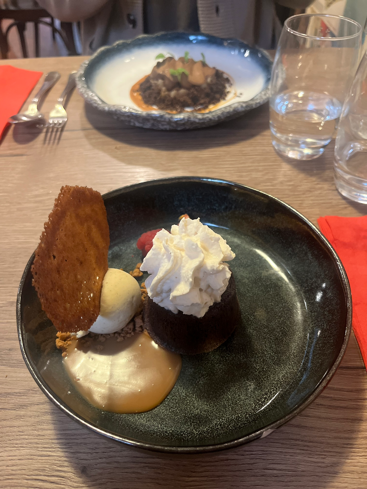 식사 메뉴를 다 비우고 포크와 나이프를 내려놓으면, 서버가 다가와서 디저트는 뭘로 할 건지 물어본다. 그러면 식사메뉴를 먹으면서 고민하던 디저트를 말하면 된다. 어느 식당을 가던 디저트가 항상 맛있어서, 고민이 된다. 나는 Mi-cuit chocolat(미큐이 쇼콜라, 초콜릿 케이크), 윌리엄은 Crumble cacao(크험블 카카오)를 주문했다.