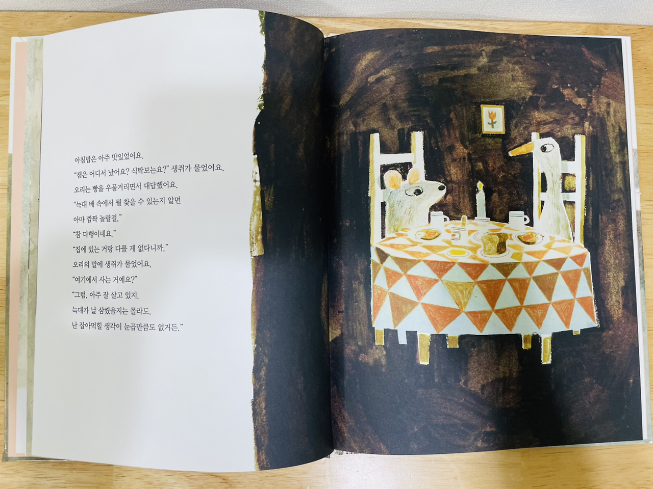 재미있는 건, 오리와 생쥐는 자신을 잡아먹은 늑대에게 복수하려 애쓰지 않는다는 것이다. 처음엔 오리와 생쥐가 늑대를 속여 파티를 열고, 늑대가 배앓이를 하는 장면이 통쾌하게 느껴진다. 하지만 곧 그것 때문에 또 다른 위기가 찾아온다. 그리고 이번엔 자신들의 안식처인 늑대를 위협하는 사냥꾼과 싸우며, 상대적 약자임에도 불구하고 늑대의 히어로가 되어 승리를 쟁취한다. 그 결과 오리와 생쥐는 늑대와의 관계에서 우위를 선점하고 공생한다. 일곱 마리 아기염소나 빨간모자처럼 사냥꾼의 도움으로 늑대의 뱃속에서 탈출해 복수하는 방법보다 능동적이면서 힘의 역전이 일어난다는 점에서 더 흥미롭다.