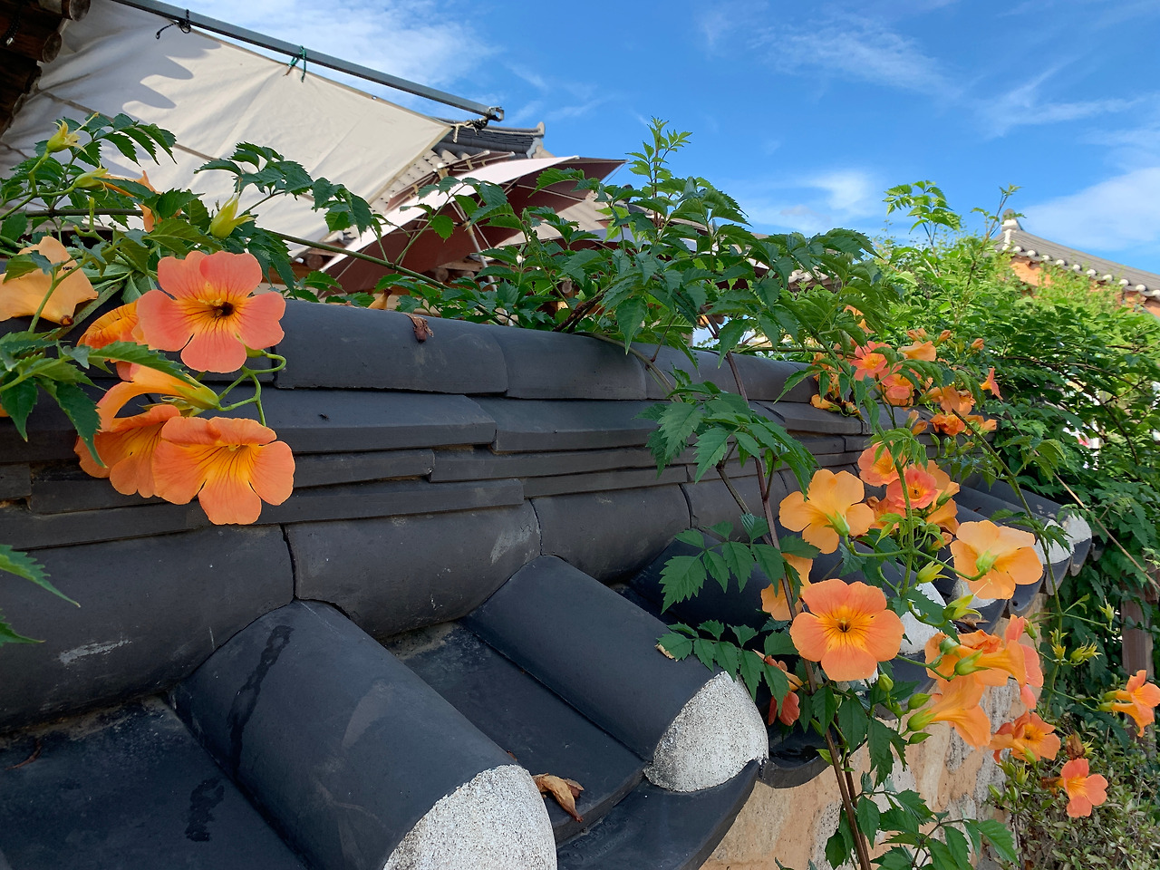 원했던 것은 코랄색에 가까운 옛 한옥담장에 늘어진 능소화였다. 나무시장에서 능소화라고 살 때는 앙상한 나뭇가지만 있기에 같은 것인줄 알고 샀는데 왠걸 꽃이 피고 보니 영 다른 것이다. 굳이 품종을 나누자면 원했던 것은 중국능소화, 산 것은 미국능소화 또는 나팔능소화로 추정(?)된다.